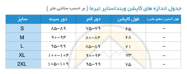 کاپشن وینداستاپر قایا مدل تیرما ( TIRMA ) یکی از با کیفیت ترین کاپشن های وینداستاپر موجود در بازار ایران می باشد که تمام ویژگی های ذکر شده را دارد , تمامی زیپ های این کاپشن YKK بوده و دارای کلاه از جنس پارچه خود کاپشن است و این کلاه از طریق یک زیپ قابلیت جداشدن از کاپشن را دارد . طراحی کاپشن کاملا به روز و خوش استایل بوده و آستر توری داخلی آن نقش عرق گیر را ایفا می کند و باعث انتقال بهتر رطوبت به بیرون می شود , این آستر در کنار قابلیت تنفسی پارچه اصلی باعث خروج قابل قبول تعریق بدن به سمت بیرون می شود